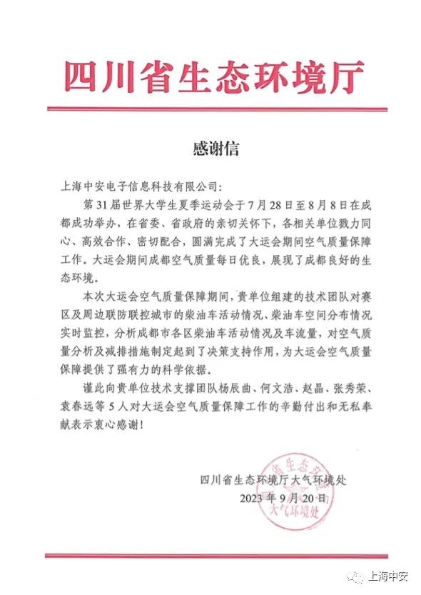 上海市生態環境局致上海中安的一封感謝信!(2025-01-10)